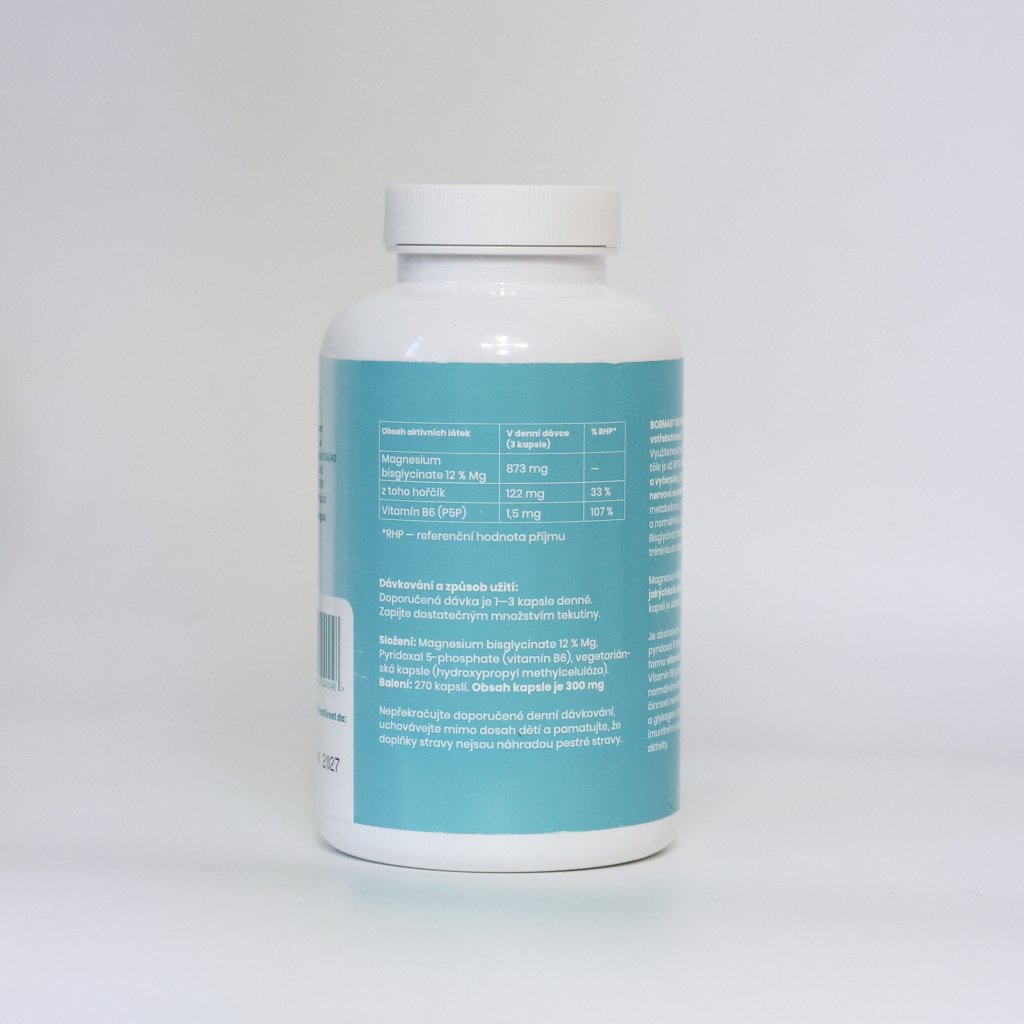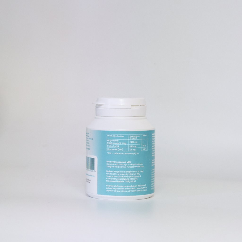Magnesium bisglycinate 12 % Mg, Pyridoxal 5-phosphate (vitamin B6), vegetariánská kapsle (hydroxypropyl methylcelulóza).